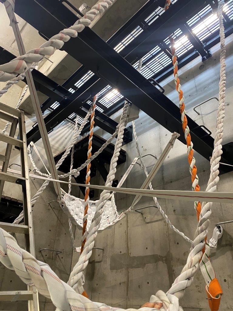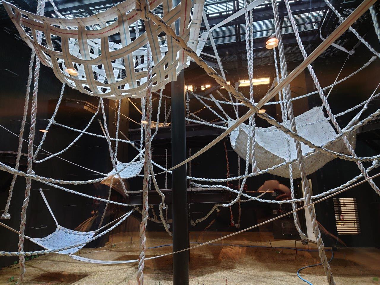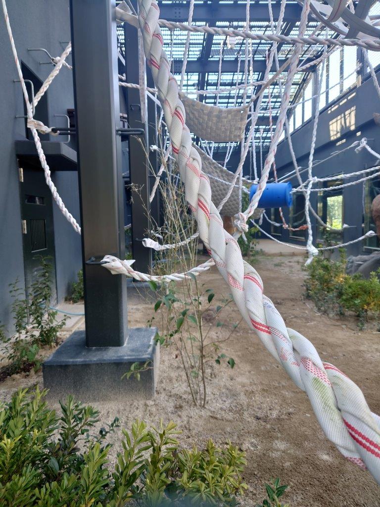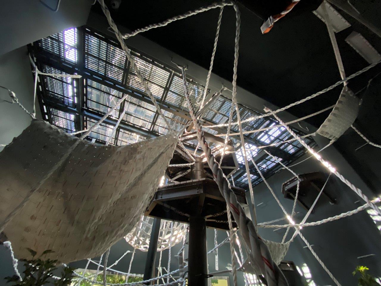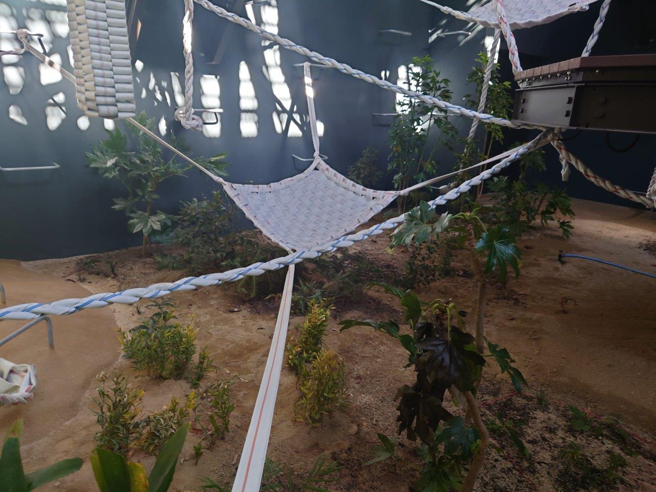 消防ホースのハンモック・ロープが張り巡らされています。